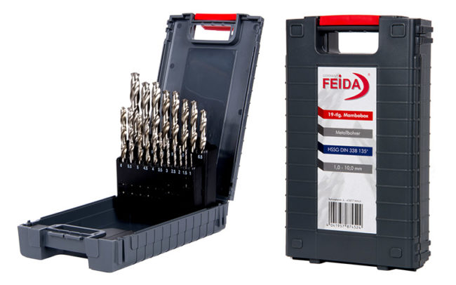 Bohrsortimente, Sets in Mambobox Tabelle Art-Nr.Inhalt 1,0 – 10,0 x 0,5mmEAN 8745219-tlg. DIN338, HSSG 135°4041957874524 8746219-tlg. DIN338, HSSG TIN, 135°4041957874623 8747219-tlg. HSSCo5%, 135°4041957874722 Tabelle Art-Nr.Inhalt 1,0 – 13,0 x 0,5mmEAN 8745325-tlg. DIN338, HSSG 135°4041957874531 8746325-tlg. DIN338, HSSG TIN, 135°4041957874630 8747325-tlg. DIN338, HSSCo5%, 135°4041957874739 Tabelle Art-Nr.InhaltEAN 872166-tlg. Forstnerbohrersatz Profi in der Beat Box ø 15, 20,…